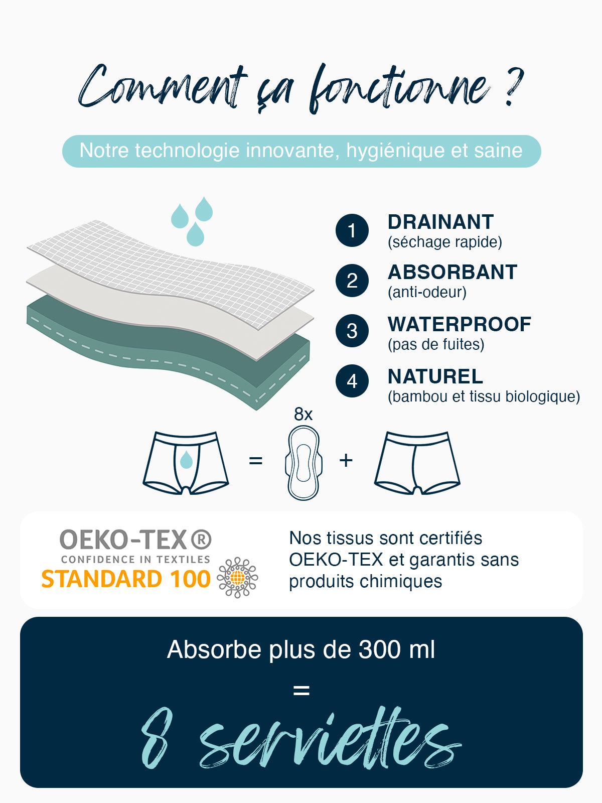 7 couches innovantes pour une absorption maximale : Nos boxers intègrent une construction unique à 7 couches, chacune ayant une fonction précise, de l’évacuation de l’humidité à la rétention des liquides, assurant jusqu’à 300 ml d’absorption, soit presque 3 fois plus que la majorité des produits du marché.
