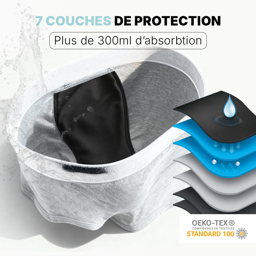 7 couches innovantes pour une absorption maximale : Nos boxers intègrent une construction unique à 7 couches, chacune ayant une fonction précise, de l’évacuation de l’humidité à la rétention des liquides, assurant jusqu’à 300 ml d’absorption, soit presque 3 fois plus que la majorité des produits du marché.